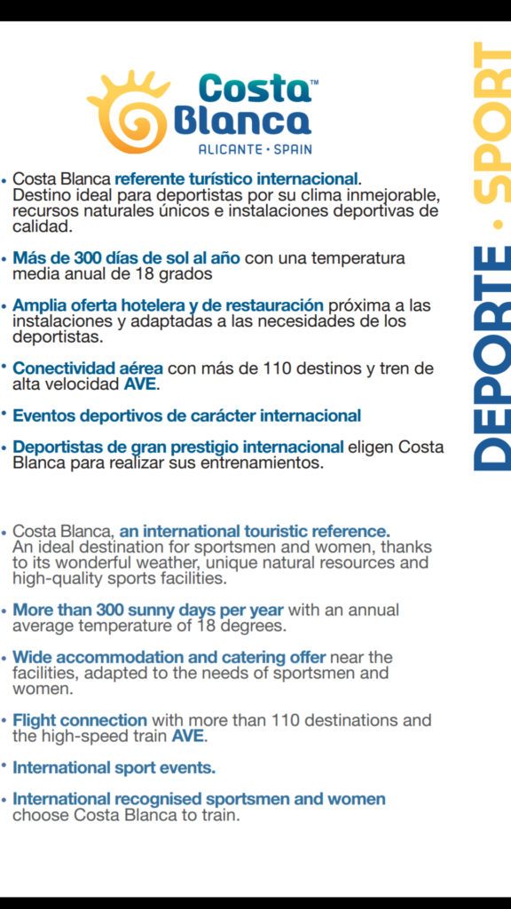 • Costa Blanca, an international touristic reference, an ideal destination for sportsmen and women, thanks to its wonderful weather, unique natural resources and high-quality sports facilites.