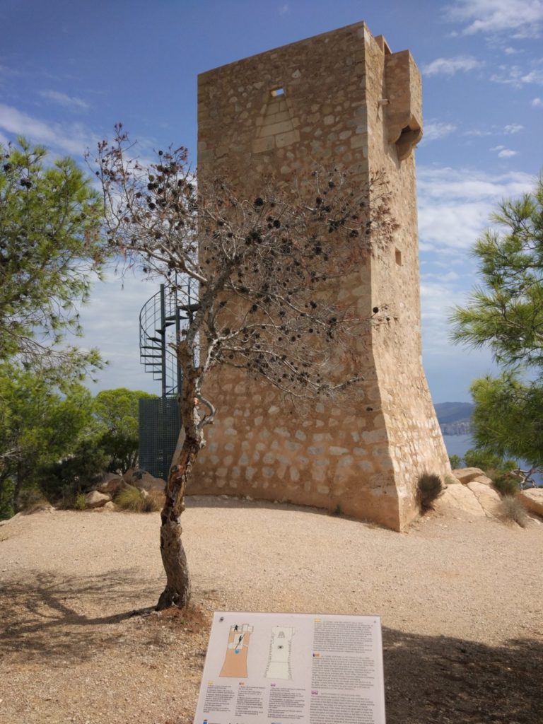 Visitaremos otra Torre Vigía del Aguiló, construida alrededor del año 1530 para avistar flotas de corsarios berberiscos antes de que desembarcaran en la costa, desde allí se pueden apreciar unas fantásticas vistas de Benidorm, Serra Gelada, Sierra de Bernia e incluso del Peñón de Ifach.