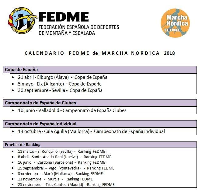 Calendario oficial de las competiciones de Marcha Nórdica FEDME para el 2018. Sin duda se nos presenta un buen año para la Marcha Marcha Nórdica o Nordic Walking, con este completo calendario que ha crecido en número de pruebas en comparación con el año anterior, lo que nos alegra e ilusiona ver como poco a poco va en evolución y expansión este deporte en España.