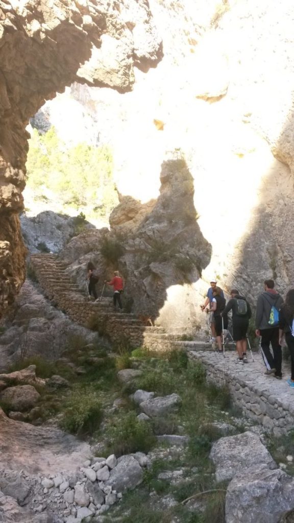 El regreso se realiza por el lecho del Barranc del Cinc, a través de una estrecha senda que discurre entre imponentes paredes de roca caliza, con numerosas repisas y abrigos en los que anidan los buitres y otras especies de aves rupícolas.