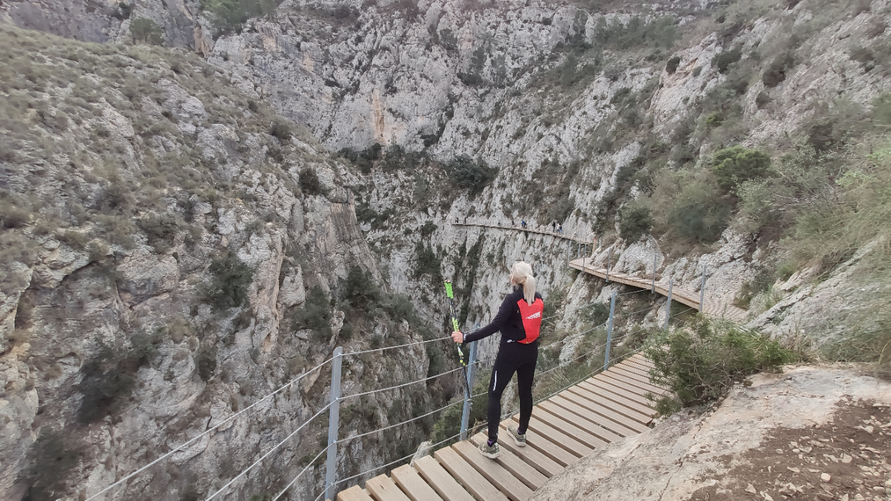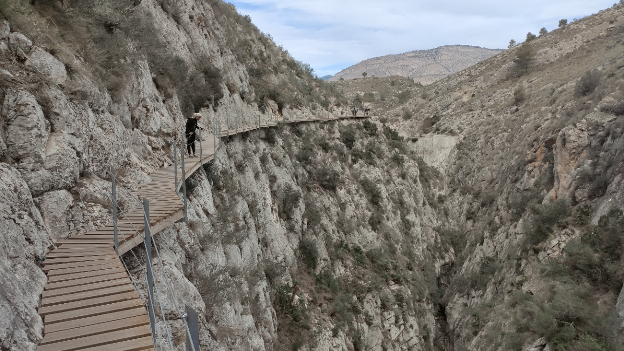 La pasarela es un recorrido formado por tablones de madera apoyados en voladizo en la pared del desfiladero. Tiene un recorrido de 212 metros (ida), al final de los cuales alcanzamos un mirador con suelo de cristal. Todo el conjunto desafía al vacío desde sus 60 metros de altura en “El Caminito de Relleu”.